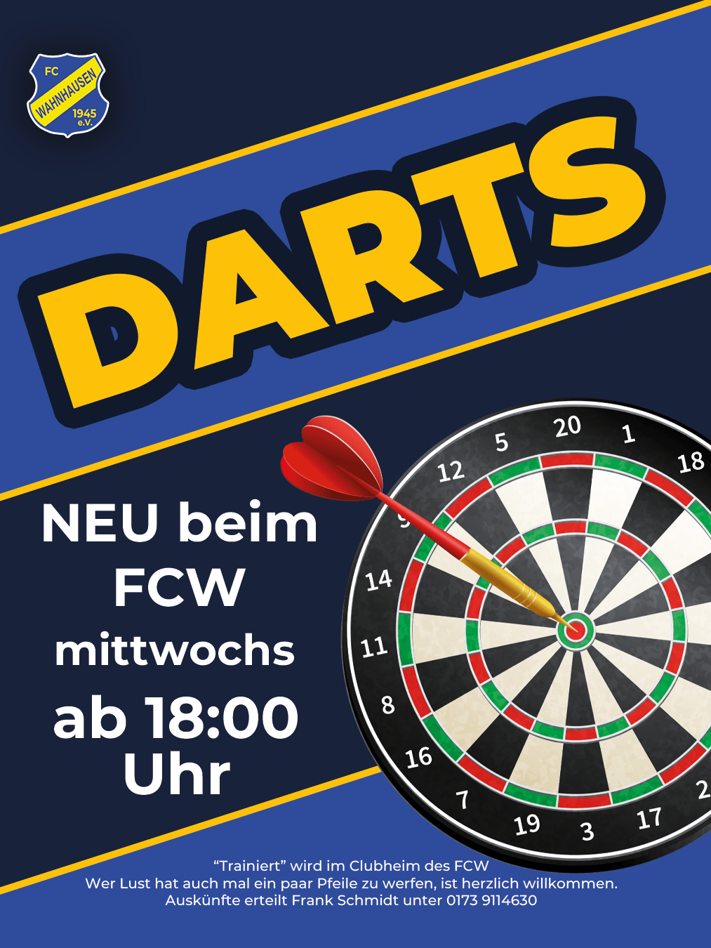 Das Training findet jeden Mittwoch ab 18:00 Uhr im FCW-Clubheim statt. Wer Lust hat, Dart auszuprobieren oder bereits Erfahrung mitbringt, ist herzlich willkommen, einfach mal vorbeizuschauen.